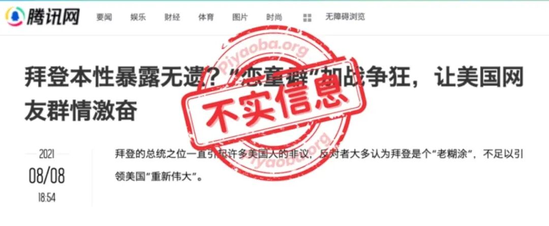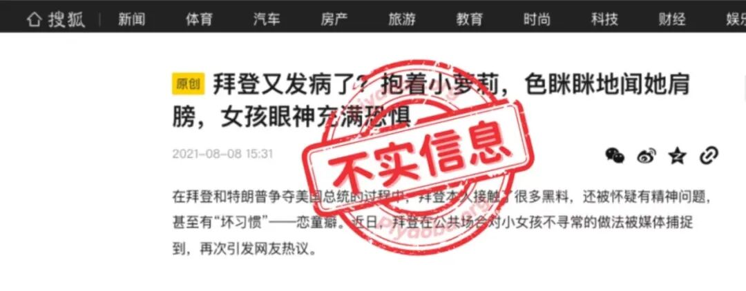 “拜登是恋童癖?”是一则旧谣言,2020年大选时已经在Facebook 流传,辟谣网站Politifact当时已经做过辟谣。此谣言在中文平台一直有流传,包括一些较大的媒体平台如腾讯网、搜狐网等。