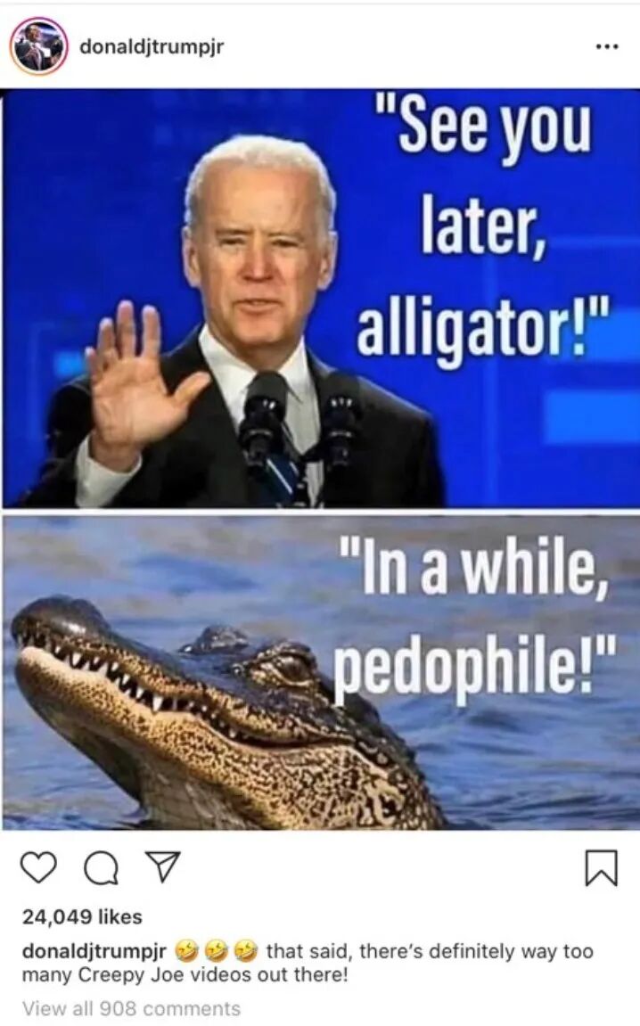 我们的团队联系拜登讨论他关于恋童癖的指控时,拜登的竞选团队向我们发了2020年5月的一份声明,该声明是为了回应川普的儿子在Instagram上发布的帖子,川普的儿子向他的300万粉丝分享了一张拜登说“回头见,鳄鱼”的图片,一张鳄鱼说“回头见,恋童癖”的照片。