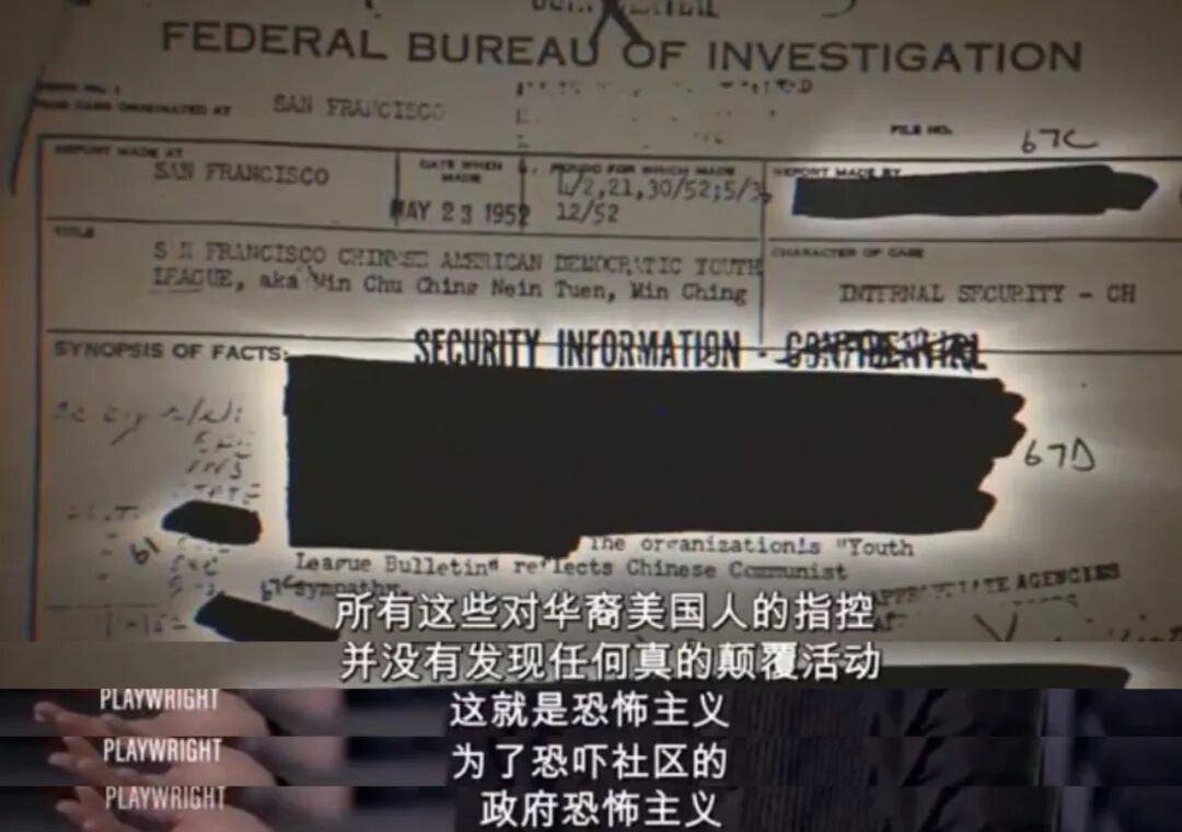 后来,美国外交部和联邦调查局以此为由开始对美国华人社区进行调查,为了调查他们给华人社区开展了“坦白计划”,无休止的骚扰并给华人社区带来创伤。直到 1966 年这个所谓的“坦白计划”彻底终结时,成千上万的华人深受其害。因此,整整一代美国华人彻底避开政治。对政府的恐惧迫使华人保持沉默。