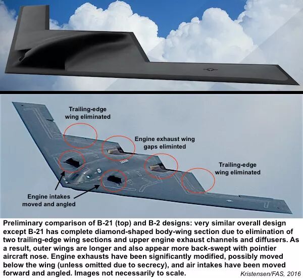 B-21具体前期论证过程严格保密,仅有一些外泄的想象图。在型号得以确定后,一些媒体报道了该机信息。在性能方面,B-21不进行空中加油情况下的航程超过9000公里,作战半径约3700-4600公里,其载弹量小于现役的B-52和B-2轰炸机,预计不超过 18吨。但当前精确制导弹药技术不断升级,过去用较多常规炸弹才能摧毁的目标,如今用少量精确制导弹药就可以完成任务。