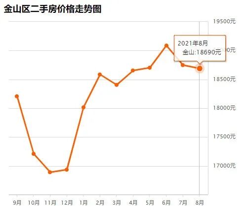 金山区8月均价 18690 元/m²,7月均价 18748 元/m² 同比上月下跌 0.31% ↓,同比去年同期下跌 4.50% ↓。