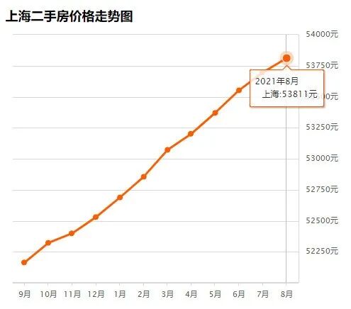 上海8月均价 53811 元/m²,7月均价 53696 元/m² 同比上月上涨 0.21% ↑,同比去年同期上涨 3.94% ↑。
