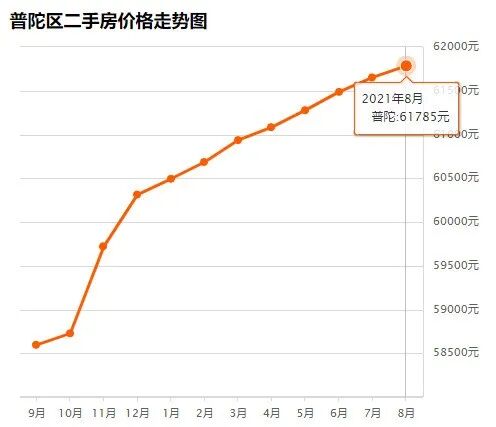 普陀区8月均价 61785 元/m²,7月均价 61652 元/m² 同比上月上涨 0.22% ↑,同比去年同期上涨 6.03% ↑。