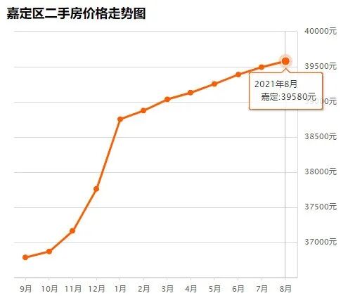 嘉定区8月均价 39580 元/m²,7月均价 39495 元/m² 同比上月上涨 0.22% ↑,同比去年同期上涨 7.62% ↑。