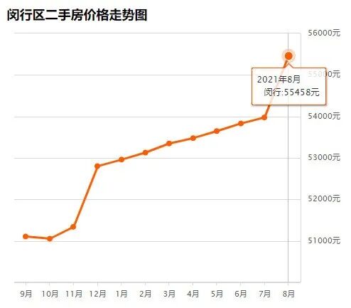 闵行区8月均价 55458 元/m²,7月均价 53975 元/m² 同比上月上涨 2.75% ↑,同比去年同期上涨 8.14% ↑。