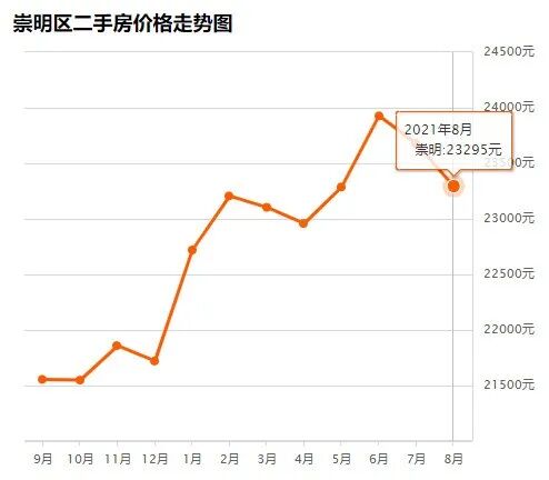 崇明区8月均价 23295 元/m²,7月均价 23680 元/m² 同比上月下跌 1.66% ↓,同比去年同期上涨 10.22% ↑。