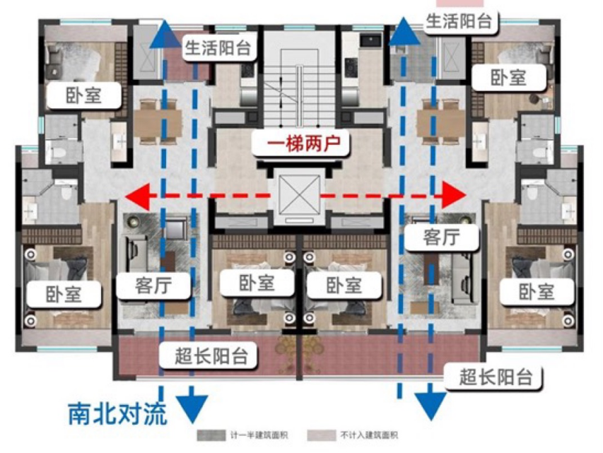 建面约105-118㎡三房户型,私梯入户,南北通透对流,阳光清风更是不请自来,可以说将居住舒适度直接拉满。