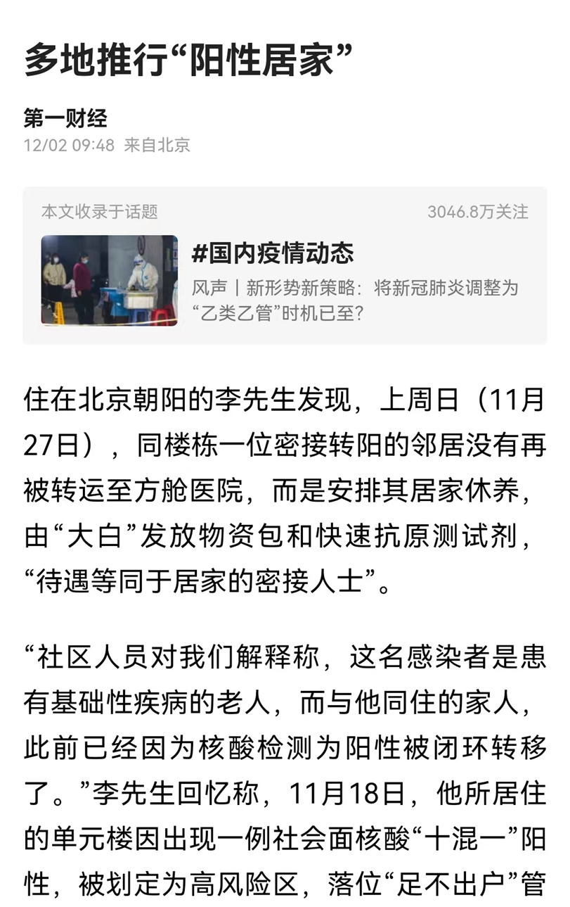 12月1日,广东东莞市新型冠状病毒肺炎疫情防控指挥部办公室发出第71号通告称,密切接触者原则上落实集中隔离观察,符合居家隔离条件的实施居家隔离。其后,深圳、广州,重庆等近十多个地市,宣布严格按照《新型冠状病毒肺炎防控方案(第九版)》进一步优化疫情防控二十条措施,及时、准确判定密切接触者,不得随意扩大密切接触者甄别范围,不以时空伴随作为判定密切接触者的标准。而在11月21日,国家卫健委已发布《新冠肺炎疫情居家隔离医学观察指南》《新冠肺炎疫情居家健康监测指南》,明确了隔离标准以及相关规定。