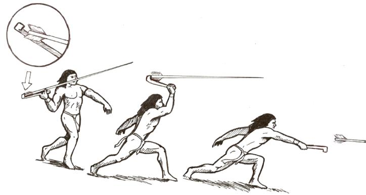 玛雅人中期主要是将黑曜石敲碎,利用其石核并进行打磨,作为矛头安装在长矛上,或者是作为镖尖配合投枪器使用。投枪器是长度大约半米的木棍,顶端具有容纳飞镖、投枪的凹槽(部分飞镖由黑曜石制成),是一种利用杠杆原理来增加投枪的初速度的工具。其中一端有杓状或钩状的支撑物来固定住投枪的尾端,使用者通常以一手抓住没有杓状或钩状物的那一端,以上臂和腕作动作将标枪投出,很容易将投掷物的初速度达到150km/h。