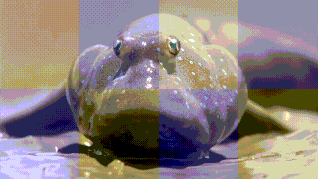 首先是弹涂鱼。弹涂鱼是弹涂鱼类(弹涂鱼族Periophthalmini)的通称,这一类鱼属于虾虎鱼目,背眼虾虎鱼科。它们大多生活在海边的滩涂上,一天中有大部分时间停留在岸上。正因为需要在水面之上保持良好的视野,它们的眼睛像潜望镜一样长在头顶。弹涂鱼没有眼睑也没有泪腺,当需要让眼睛保持湿润的时候,就会把眼睛向下缩回到眼窝里,这样看上去就像是在眨眼。