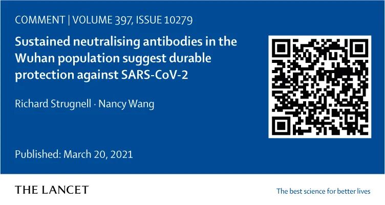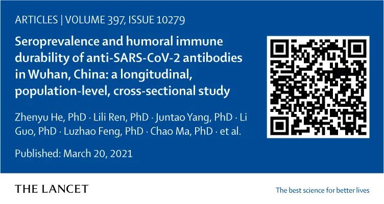 《柳叶刀》(The Lancet)于北京时间2021年3月19日早发表首项在武汉市居民中开展的长期血清流行病学的随访研究,揭示武汉人群的抗体阳性率和抗体水平动态变化。识别如上二维码或点击文末“阅读原文”,参阅论文原文。