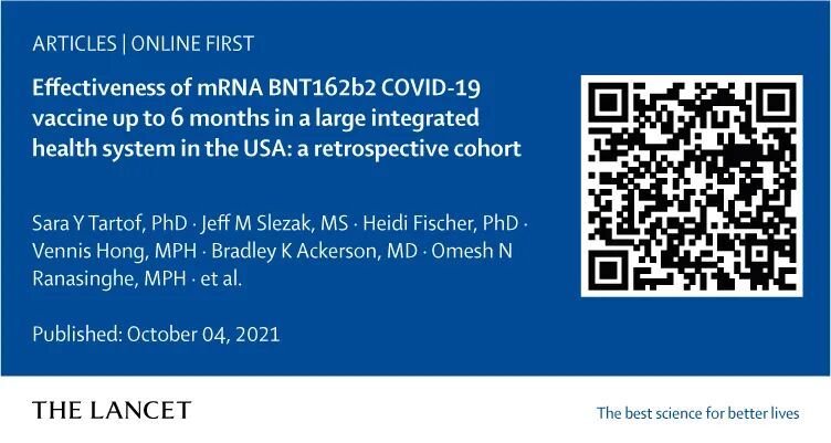 《柳叶刀》(The Lancet)发表一项最新研究,对于包括德尔塔变异株在内的所有新冠病毒毒株,接种两剂BNT162b2疫苗预防COVID-19相关住院的有效性可达90%,且至少维持六个月。在研究期间,该疫苗对于预防所有SARS-COV-2感染的有效性逐渐减弱,从接种两剂疫苗后一个月内的88%下降到五个月后的47%。研究人员发现,疫苗预防感染的有效性降低可能是由于疫苗的免疫效力减弱,而不是因为德尔塔变异株能够逃避疫苗保护。