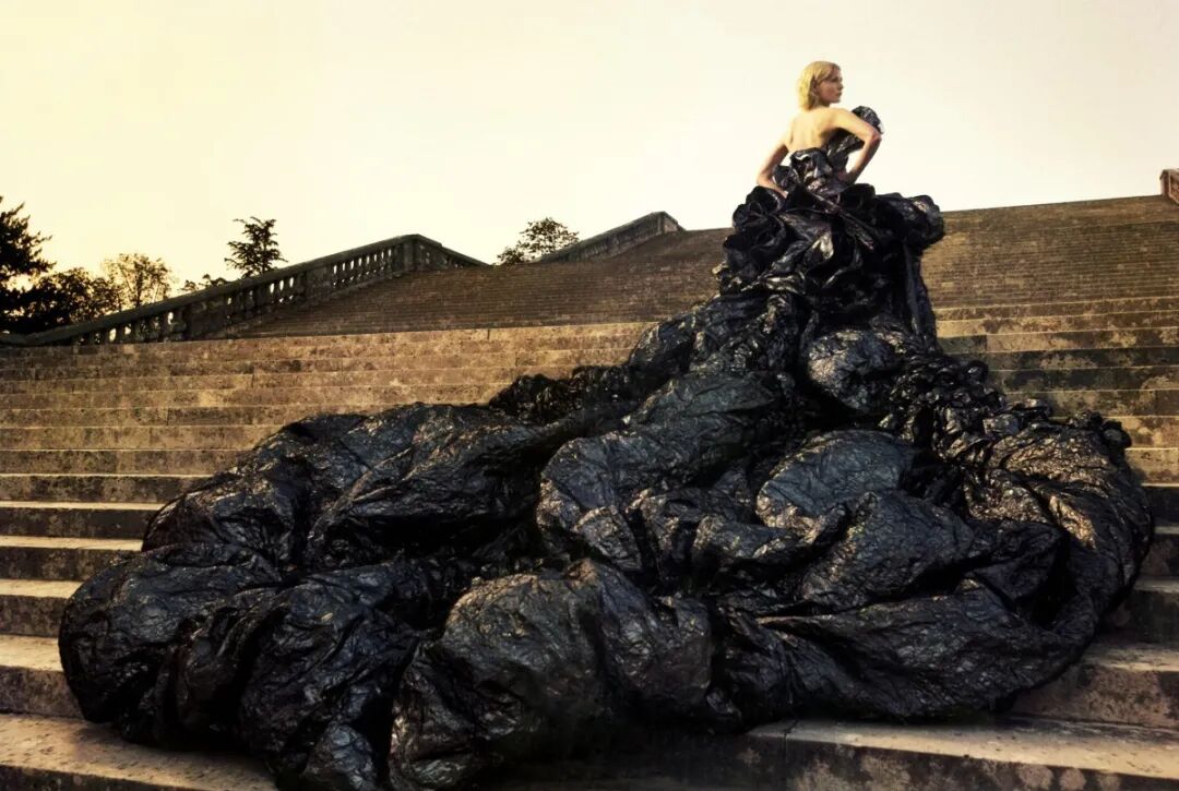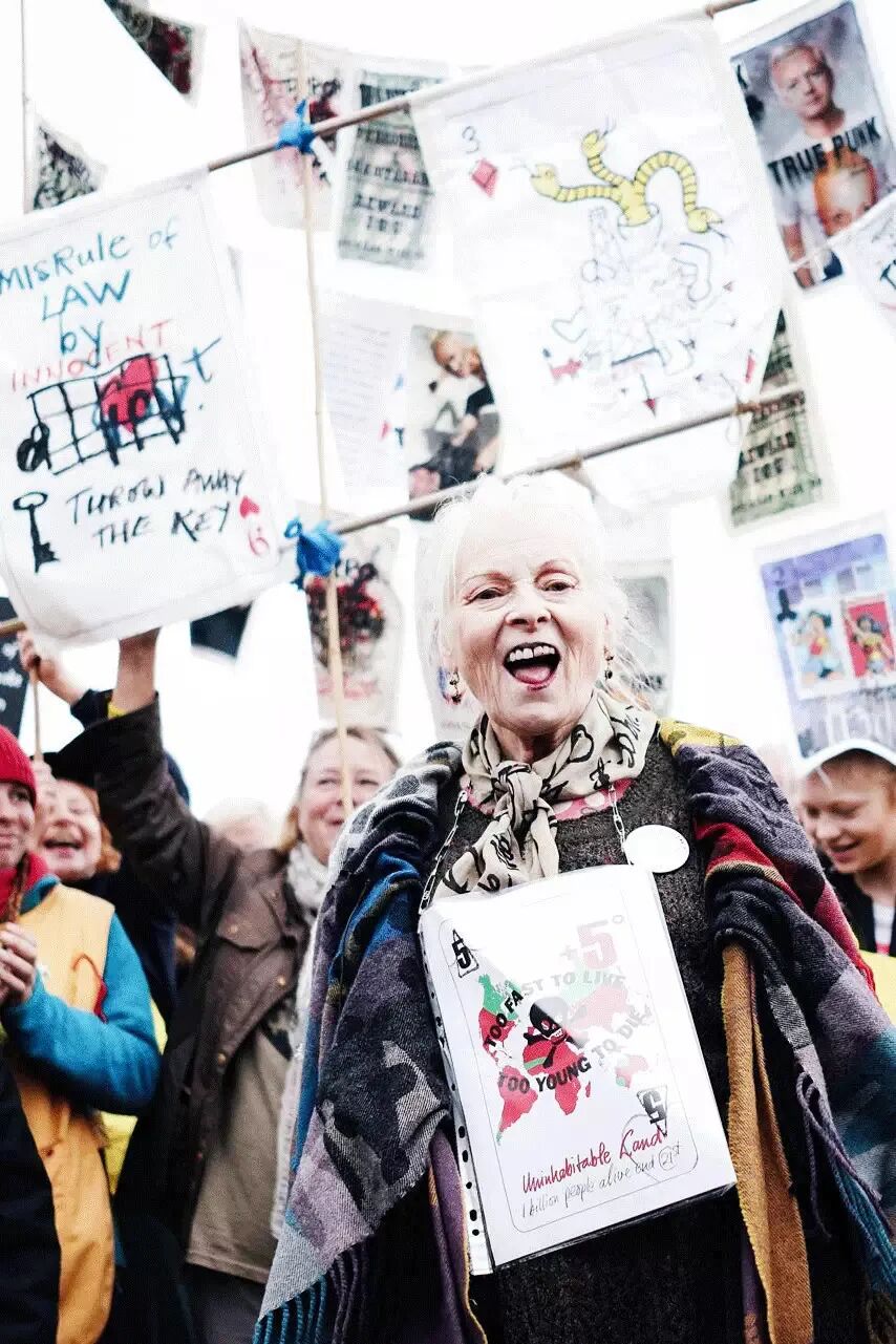 Aldous Huxley一篇文章中提到,无休止的干扰是世上最可怕的恶魔之一,对此Westwood也无比认同。她认为当今信息的轰炸、流行文化的侵蚀让人们无暇去思考自我,“你必须停下来思考,不然你就会变成政治宣言的牺牲品”。她的两个设计系列“政治宣言”(Propaganda)与“积极抵抗”(Active Resistance)给予了大众乐观主义的支持,让人们能跳脱信息绑架、有更多独立思考的空间。 左右滑动查看更多Vivienne Westwood, Vive La Cocotte, AW 1995 当记者问到Vivienne Westwood如何用时尚为大家打开视界,她说自己用时尚来表达观点。在她的创作生涯中,看到了太多的腐败、折磨、死亡与苦难,因此她决定用设计来呈现议题。她试图推翻守旧传统的桎梏,对权利体系的掌控深恶痛绝。在这个被Thomas Mann夸张却写实描述的“一切皆为政治”的时代,Westwood始终坚信艺术无法像19世纪法国唯美主义那样独善其身,作为“唯一剩下的朋克”她坚守阵地,义不容辞。