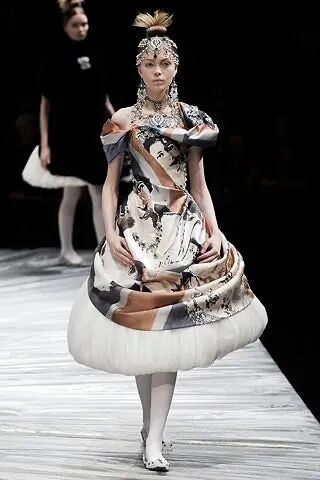 John Galliano, AW 2004-5 朋克的辐射范畴从音乐艺术扩展到绘画领域,在与绘画渗透交互的同时,绘画的风格手法也被喜爱朋克的服装设计师融入作品之中。Pollock的泼溅画被麦昆揉进了1999年春夏系列创作中,坎姆顿带着历史沉疴的混乱能量与19世纪英国手工艺运动为朋克增添了“纺织工艺的硬边”。