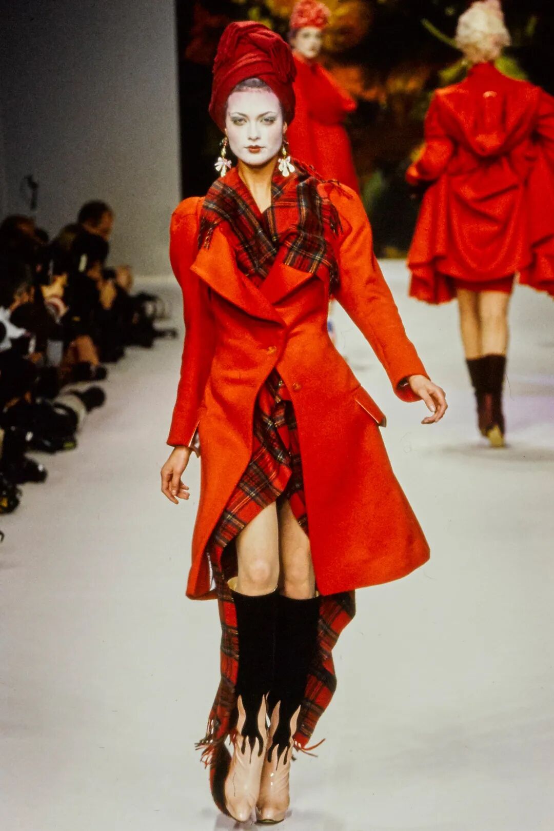 Vivienne Westwood, Anglomania, AW 1993 被“西太后”亲自盖章认证的、最能代表她设计美学的系列当属1993年秋冬,Anglomania。有着设计师最爱的苏格兰格纹、哈里斯粗花呢与盎格鲁-撒克逊传统下爱德华七世风格的宫廷华丽。在现代语境的大环境下,Westwood所代表的朋克精神正如她在2012年采访中所述,她的服装给予大众一种时代的顺从,它们都代表着女权主义与女性力量而不是仅仅看上去有男子气概。 左右滑动查看更多Vivienne Westwood, Vive La Cocotte, AW 1993