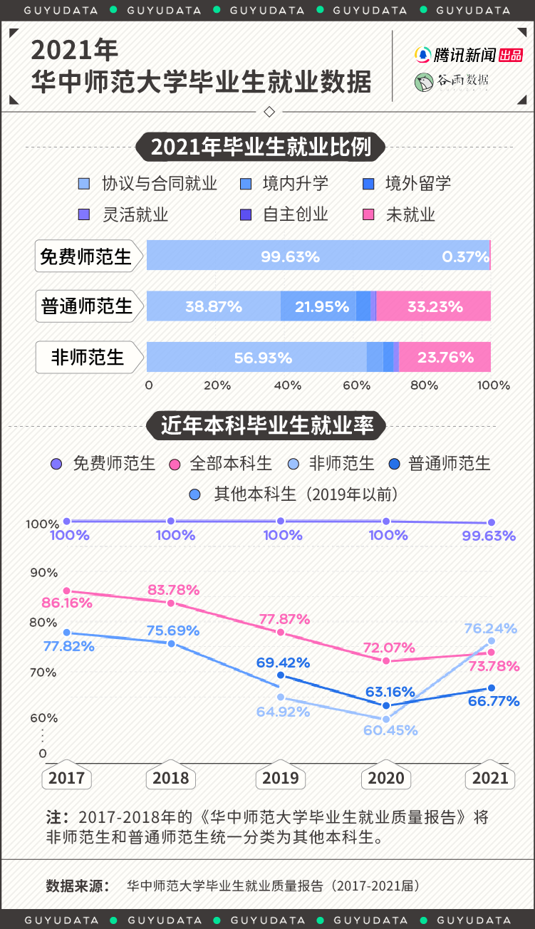 作为教育部直属六所师范大学之一,华中师范大学发布的《毕业生就业质量报告》显示,2021届普通师范本科毕业生的未就业率超过非师范生,达到33.23%。