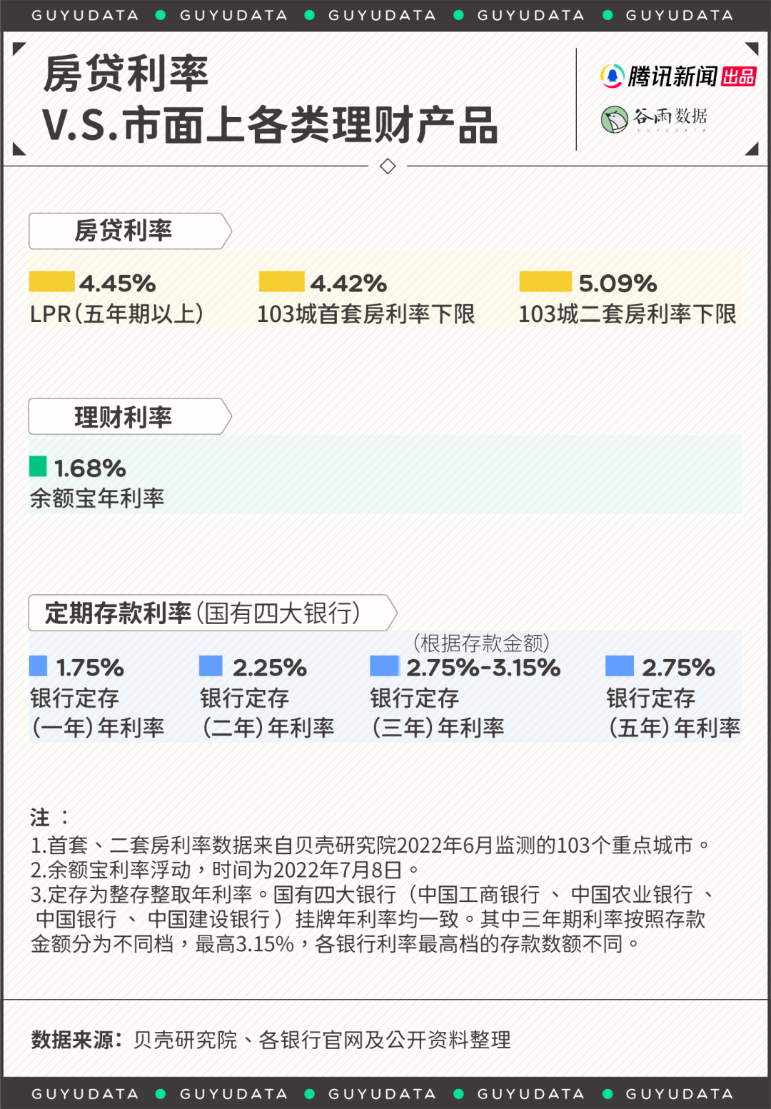 房贷这边,即便今年房贷利率随着LPR在降低,今年6月,贝壳研究院监测的103城首套房利率下限,降到了首套房4.42%。但利率也依旧高于市面上一般的理财手段。