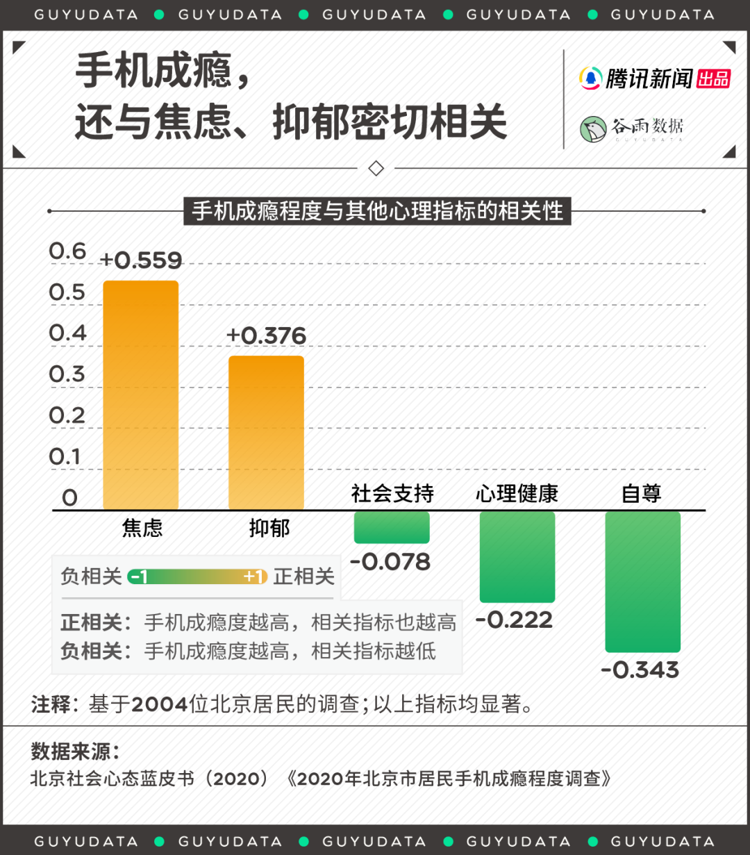 一项对北京居民的调查显示,手机成瘾程度与焦虑、抑郁状态密切相关。上瘾度越高的人,通常也会表现出更高的焦虑与抑郁指标。