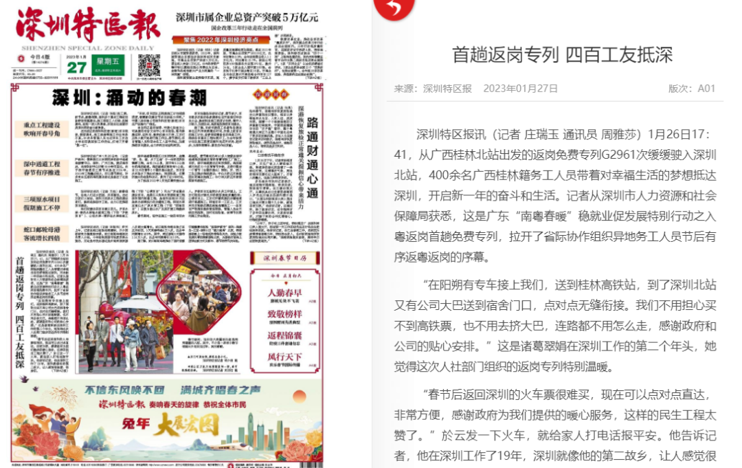 最吸引眼球的的是“首趟返岗专列 四百工友抵深”的报道:1月26日傍晚,首趟返岗免费专列抵达深圳,从广西为深圳运回了400多名工友。报道说:为了“抢回”这批工友,官方在阳朔安排了专车接人,送到桂林高铁站,到了深圳北站又有公司大巴送到宿舍门口,点对点无缝衔接。报道还说,类似的免费专车、专列会大量安排,成为今年深圳参与“抢人大战”的常态。事实上,早在半个月前的1月12日,深圳就公布了节后“抢人大战”的政策红包,深圳人社局在《关于实施阶段性鼓励用工有关举措的通知》中宣布:1、对2月5日前市外原在岗职工返岗达500人以上的企业(劳务派遣单位除外),按照每人200元的标准发放一次性返岗交通补助,每家企业最高40万元。