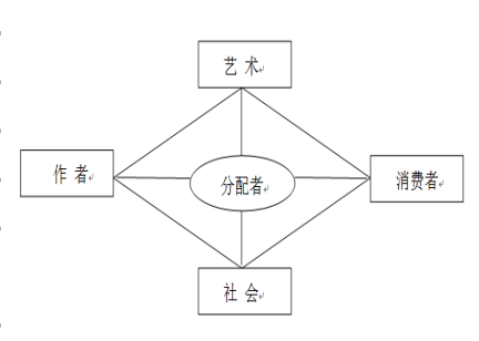 现当代艺术研究的分析框架长期受到美国艺术理论家艾布拉姆斯的艺术四要素论的影响。每一件艺术品总要涉及四个要点:作品、艺术家、世界、欣赏者。尽管一般理论会涉及四个要素,但批评家往往根据其中一个要素,来界定、划分和剖析艺术品的主要范畴,生发出借以评判艺术品的四类价值标准,如图1。在这个分析图式中,艺术品作为阐释的对象被置于整个理论框架的中心。其中有三类理论,即摹仿说、表现说、实用说,主要根据作品与另一要素(世界、艺术家或欣赏者)的关系来解释作品,第四类客观说则把作品视为一个自足体孤立起来加以研究,认为其意义和价值与任何外界事物无关。这种理论框架与英美新批评一致,是一种静态的、共时性的内部研究,具有鲜明的作品中心论色彩,忽视了作品意义的生成语境以及作品的生产、传播与接受机制。
