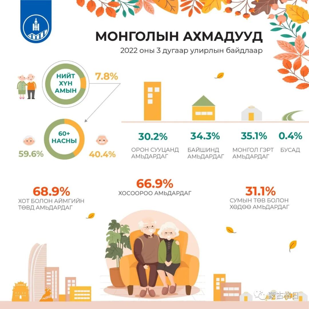 截止今年第三季度,60岁以上的老年人占蒙古国总人口的7.8%。其中,59.6%是女性,40.4%是男性。