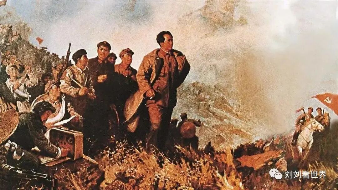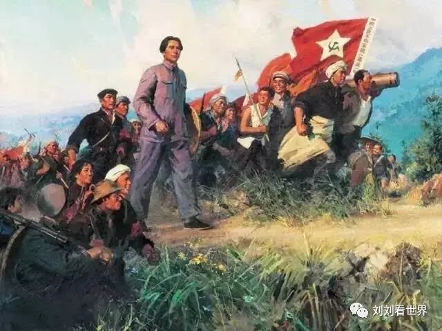 毛泽东草鞋短衫,当时还是长发,一路脚上磨的全是血泡,却谈笑风生、镇定自若,和士兵们一路走一路拉家常,润物细无声的做思想工作,一起吃大锅饭一起睡荒郊野外。