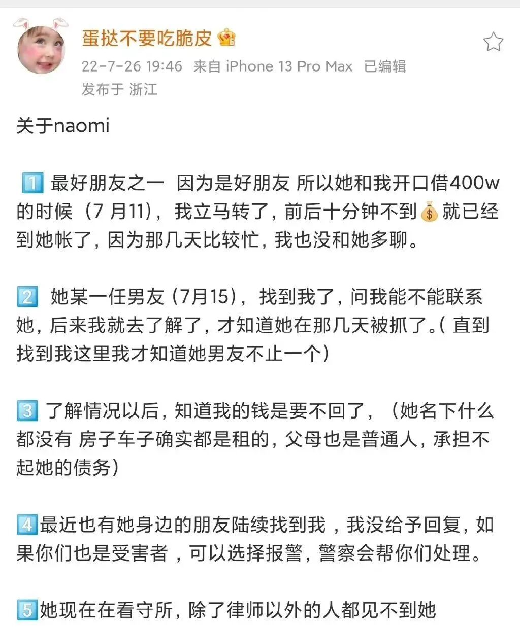 根据公众号平台最新的推送规则,如果不想错过八妹的文章,记得标星标哦,以前加过的也需要重新添加,这样每次新文章推送才会第一时间出现在你的订阅列表里。人生总会有遗漏,但是不要忘记 “添加星标”哦!!!前段时间,大家都被韩剧《安娜》里的“假名媛”刷新了眼界:一个贫民窟女孩,靠诈骗一步步实现阶级跃迁,把韩国上流圈玩得团团转。回到现实世界,一个普通人想迅速进入上层圈子,和富二代们打交道,真的可以靠诈骗一路逆袭嘛?24 岁网红Naomi经常在社交平台上炫富,晒豪车豪宅,还为帅气的男主播打榜,并且一出手就是几十万,因为出手阔绰在圈内小有名气。就是这样的“白富美”被网友爆料诈骗金额高达一个亿,微博网名“蛋挞不要吃脆皮”的网红发文称,Naomi是自己最好的朋友之一,对方在7月11日向她借了400万,结果钱要不回来了。随着更多的人出来爆料,原来所谓的名媛身份,都是Naomi通过诈骗的钱来包装的,豪车豪宅都是租的,为的就是打入上海富人圈,交往富二代。据透露,Naomi父母是普通人承担不起她的债务,现在她也进了看守所,只有律师可以见她。她努力想要跨越阶级,却成了“上海版夭折安娜”,靠诈骗的财富来堆砌名媛人设,注定是一个悲剧。Naomi,24岁,是一名直播网红,通过社交平台可以看出来身材和长相都很出众,打造的人设就是“一个在国药上班的名媛”:为了更好得伪装自己的名媛人设,她还谎称自己父母双亡。她平时开直播的时候就是炫富,让大家看她的支付账单,仅微信支付2021年就支出约488万,平均一个月也就花四十来万吧:她在上海古北壹号和杭州的壹号院都有房产,名下包括RR库里南和RR魅影在内的5台豪车。根据网友爆料,Naomi 只是某集团一位普通的采购员工,借职务之便,通过私刻印章(违法)的方式,做了很多采购单,又把供应商的货品私下买卖,非法获利一个多亿。爆料还透露,Naomi有多任男友,都是帮她销赃的工具。而那些所谓的豪宅和豪车都是租的,她自己名下其实都没有,而她的父母也都是普通人,根本无力偿还债务,因此网友们猜测她可能要面临无期徒刑。这些爆料,也被一个有五十多万粉丝的网红@愤怒的WZY在直播中证实了。因为Naomi是他直播间的“榜一大姐”,之前给他的直播打赏过50w左右。前不久,他被有关部门联系,被告知Naomi涉及一个亿的诈骗案,现在这50w属于是他的非法所得,需要退换这部分钱。刻萝卜章骗了一个亿就是为了混进富二代的圈子,当精心营造的人设崩塌时,为自己过错买单的只有自己。Naomo在被爆出来涉嫌诈骗前一个月,就没有出现过了。她的微博发文停留在 6月28日,至今一个月没有更文,也没有跟网友互动。有网友说:这样坑蒙拐骗到底图什么呢,最后还不是一副手铐和铁窗生活。其实Naomi的骗局没有被揭开,她或许真的可以用名媛人设来换取一条获取财富的捷径也说不定。为什么伪装名媛就能把富人圈子耍的团团转呢?其实当下的社会环境,炫富已经成为一种标签。“先敬罗裳后敬人”,光鲜亮丽的外表加上谈吐优雅,足以让人忽略这个人本身。还记得那个把半个纽约的上流人骗的团团转的德国女子嘛?她就是安娜 · 索罗金,被称为“纽约第一假名媛”。安娜一个在俄罗斯出生的德国人,因为艳羡上流社会生活,她谎称是自己一个有6000万美刀信托基金的富二代。![]()