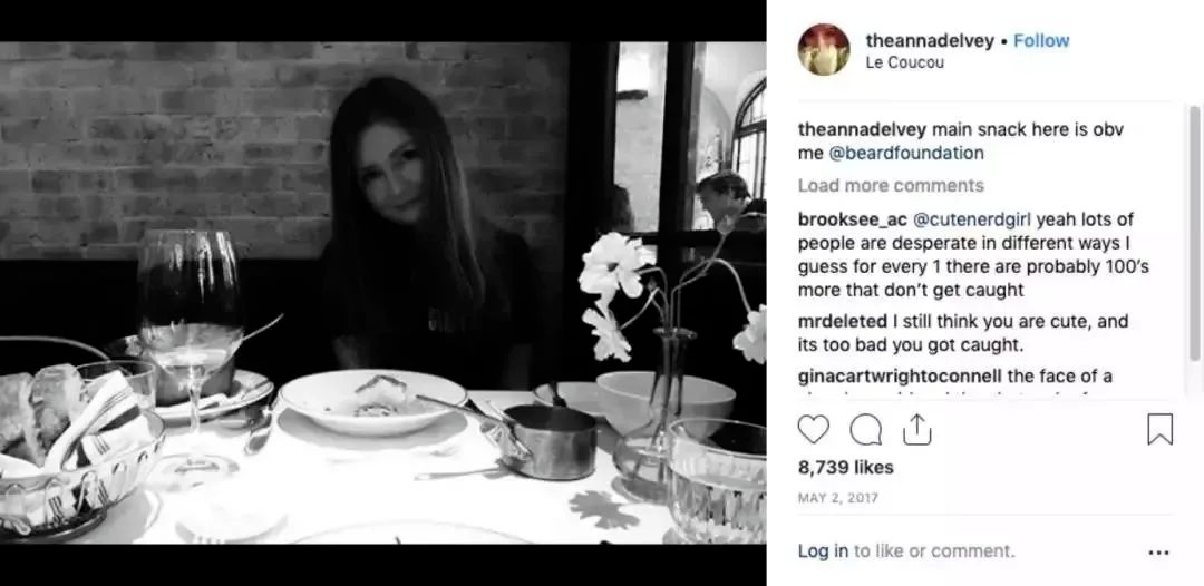 ▲“上流名媛”安娜·德尔维其实是卡车司机的女儿安娜·索罗金住在纽约的高档酒店,带朋友出入上流餐厅,给的小费都是100美元起,还曾包下一架私人飞机前往奥马哈参加巴菲特公司的股东大会……在精心包装下,安娜成为纽约社交圈的名媛。利用假名媛身份,短暂实现阶级跨越,更让无数有钱人为她自掏腰包,付着高昂的账单费用。“她踩着Gucci的凉拖,戴着超大的Céline太阳镜走进了我的生活,向我展现她在奢侈酒店过得迷人又绚烂的生活,带我参加Le Coucou晚宴、去红外线桑拿浴室、去摩洛哥度假,然后她拿着我的62000美元消失不见了。”