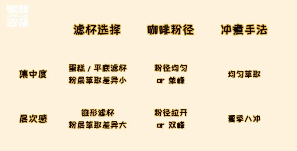 而在这个冲煮思路里面,我们分三个主要变量,分别是滤杯、咖啡粉径和冲煮手法,同时这三个变量还会分为“层次”和“集中”两个类别。层次感比较好理解,就是味道的丰富程度,而集中度则是风味清晰度和干净度。首先要说明,这两者没有好坏,只是个人的口味偏好和针对不同特性的咖啡豆,我们所做的取舍。同时我们再次强调,这个分享是给大家一个新思路,抛砖引玉,大家不要太纠结于某一个滤杯、磨豆机或者某个注水的手法。![]()