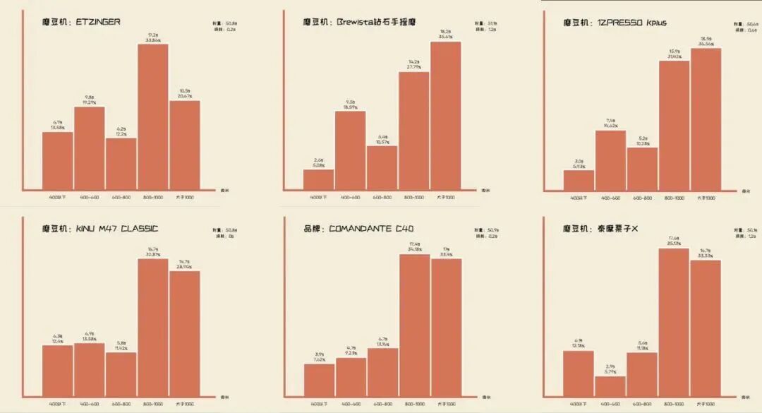 目前主流滤杯有两种——锥形和蛋糕形,分别对应了“集中”和“层次”。锥形滤杯会有一个夹角,所以上下粉层的高度差较大,咖啡粉萃取的差异性也会比较大,例如温度、时间等等都会有区别,所以大多数常见的锥形滤杯都会有比较好的层次感。蛋糕滤杯底层面积更大,咖啡粉堆积高度较低,萃取的状态也更接近,反映到感官里面就是味道比较集中。当然,这里我们讨论的是一个大类,如果有一些特殊的滤杯,大家可以在评论区继续讨论。然后我们来到咖啡粉径,这个主要关系到磨豆机。通常来说,当磨粉效果越均匀,咖啡在感官上的表现也会更集中。一些磨豆机会故意把粉径做成双峰的设计,除了有集中度高的粗粉,也会保留一部分的细粉,就是走层次方向的磨。例如我们上次测试手摇磨的粉径,C40就是比较典型的单峰集中度高,而B家的钻石手磨会在400-600微米上多做了一个波峰,走的就是层次感。而除了磨豆机之间的差异,相同磨豆机的转速也会有影响,不算严谨的经验之谈,高转速的粉径会偏向细粉稍多,也就是层次感的方向,低转速细粉会少一些。所以我们建议大家可以了解一下自己磨豆机的走向,是更偏层次还是集中。因为如果想要喝集中度高的咖啡,但选了个突出层次感的磨和滤杯,结果就不是那么理想了。这里再重新分享上次测试的一些手磨的粉径参数,还有我们收集的一些粉径图表,大家可以参考一下。(p.s.关于细粉的作用我们就先不展开来说,因为又是另一篇文章了,今天我们从宏观一点的角度来看冲煮思路。)更加均匀的萃取手法,会偏向集中度更高的感官感受。如何获得更加均匀的萃取,我建议大家去看李震的分享。相反,怎么在冲煮上拿到更多层次感?像是扰流多,时间拉长,都是可以的,还有一个最被大家熟知的,就是夏季八冲。![]()