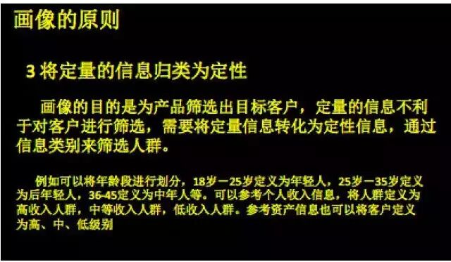 将金融企业各类定量信息,集中在一起,对定性信息进行分类,并进行定性化,有利与对用户进行筛选,快速定位目标客户,是用户画像的另外一个原则。