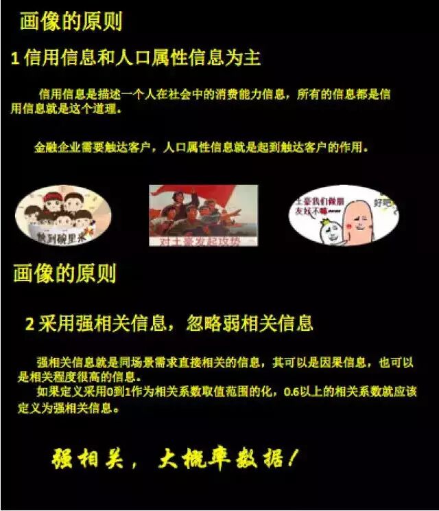 事实上,用户画像涉及数据的纬度需要业务场景结合,既要简单干练又要和业务强相关,既要筛选便捷又要方便进一步操作。用户画像需要坚持三个原则,分别是人口属性和信用信息为主,强相关信息为主,定性数据为主。下面就分别展开进行解释和分析。