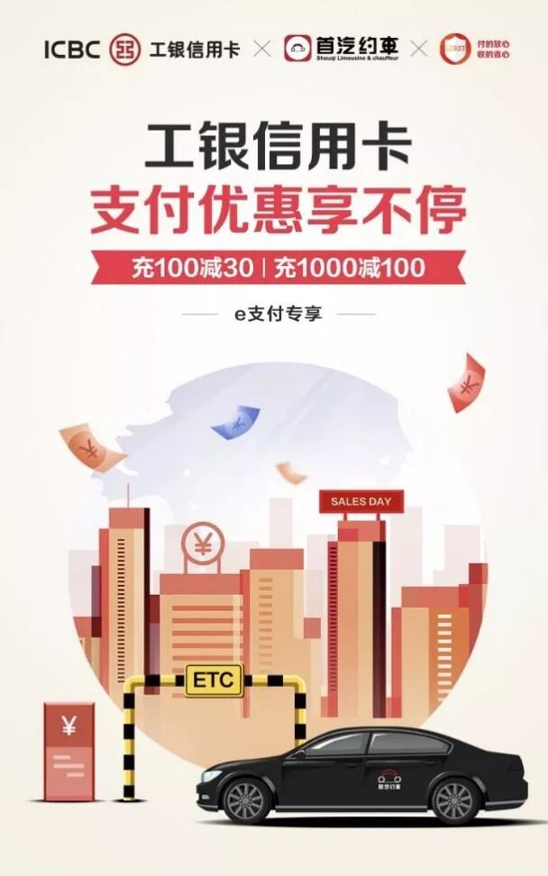 ❂ 活动内容:活动期间每日10:00起,使用工银信用卡在首汽约车移动端APP的充值订单结算页面选择工商银行“e支付”受理通道进行支付,即有机会享单笔交易充100元立减30元,充1000元减100元两档优惠活动。 名额有限,先到先得。