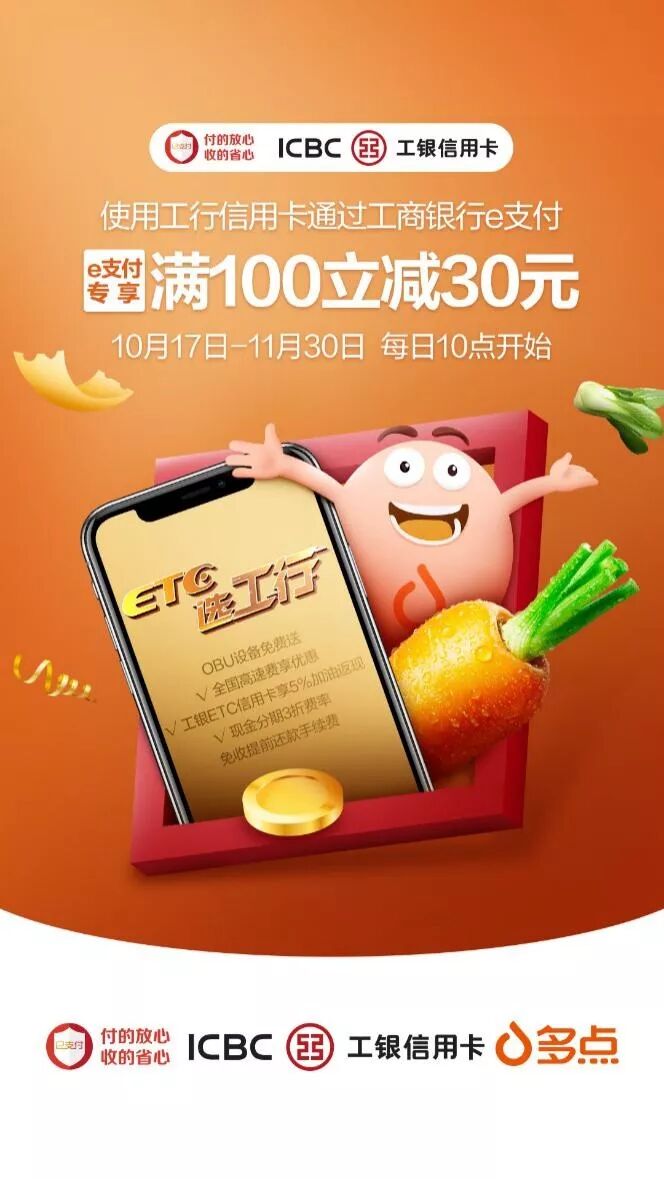 ❂ 活动内容:活动期间每日10点起,在多点最新版APP客户端上,使用工银信用卡通过工商银行e支付完成在线付款,即有机会参加单笔消费满100元立减30元优惠。名额有限,先到先得。