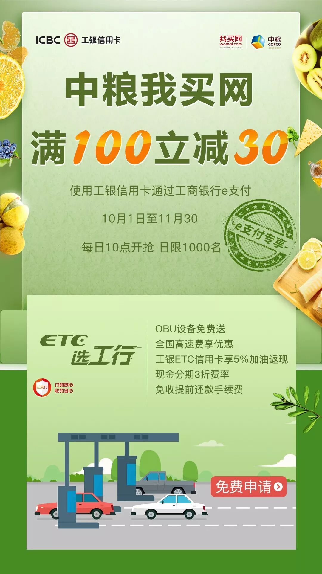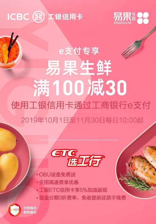 ❂ 活动内容:活动期间每日10:00起,在易果生鲜APP使用工银信用卡通过工商银行e支付完成在线付款,即有机会参加单笔消费满100元立减30元优惠。名额有限,先到先得。