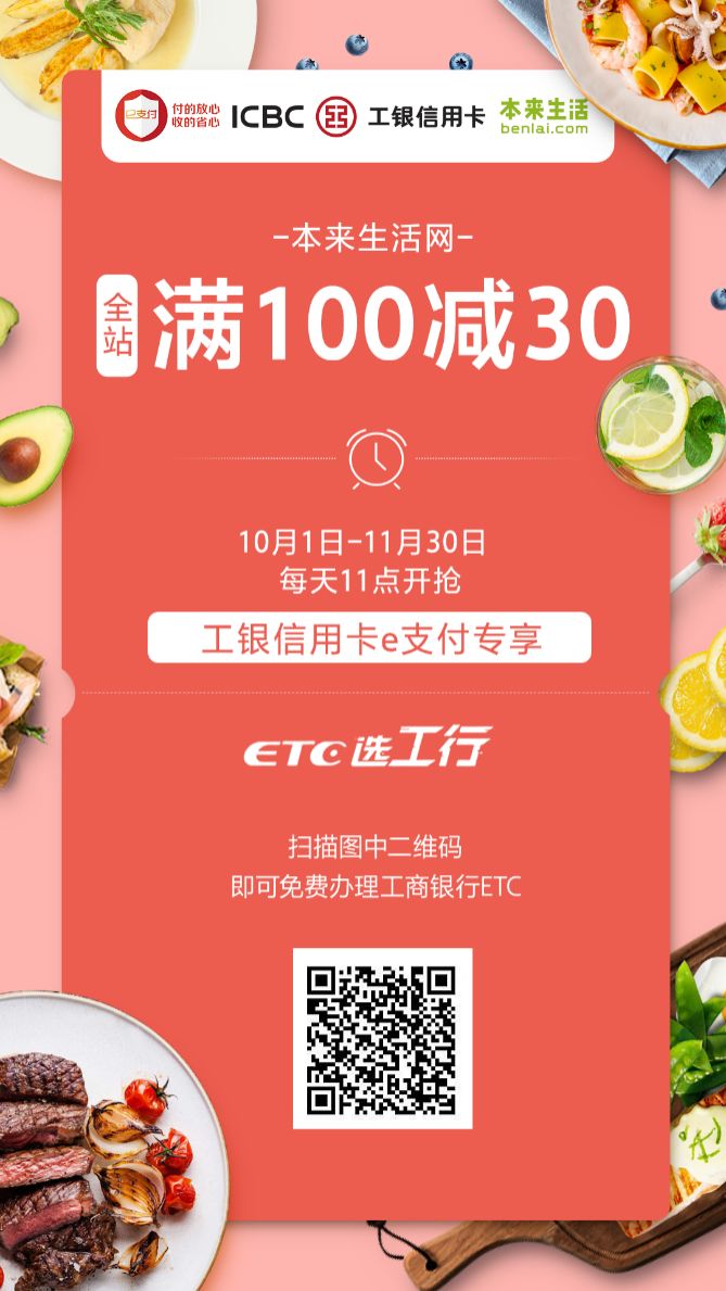 ❂ 活动内容:活动期间每日11点起,在本来生活移动端APP及PC网站,使用工银信用卡通过工商银行e支付完成在线付款,即有机会参加单笔消费满100元立减30元优惠。名额有限,先到先得。