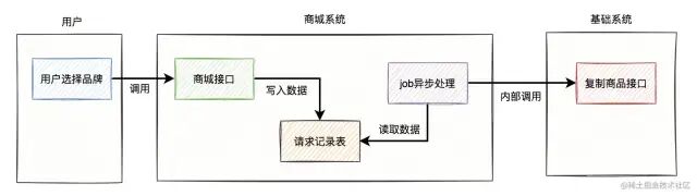 用户调用商城的接口,他们会往请求记录表中写入一条数据,然后在另外一个job中,异步调用基础系统的接口去复制商品。
