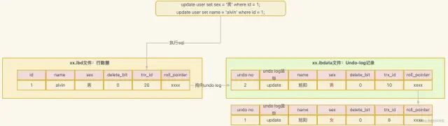 trx_id,当一个事务对某条聚簇索引记录进行改动时,就会把该事务的事务 id 记录在 trx_id 隐藏列里;roll_pointer,每次对某条聚簇索引记录进行改动时,都会把旧版本的记录写入到 undo 日志中,然后这个隐藏列是个指针,指向每一个旧版本记录,于是就可以通过它找到修改前的记录。InnoDB 里面每个事务有一个唯一的事务 ID,叫作 transaction id。它是在事务开始的时候向 InnoDB 的事务系统申请的,是按申请顺序严格递增的。