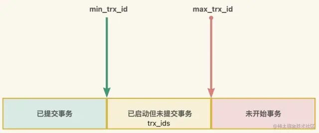 trx_id属性值与ReadView中的 creator_trx_id 值相同,意味着当前事务在访问它自己修改过的记录,所以该版本可以被当前事务访问。如果落在黄色部分,那就包括两种情况