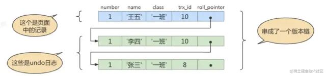 如上图所示,针对id=1的这条数据,都会将旧值放到一条undo日志中,就算是该记录的一个旧版本,随着更新次数的增多,所有的版本都会被 roll_pointer 属性连接成一个链表,我们把这个链表称之为版本链,根据版本链就可以找到这条数据历史的版本。