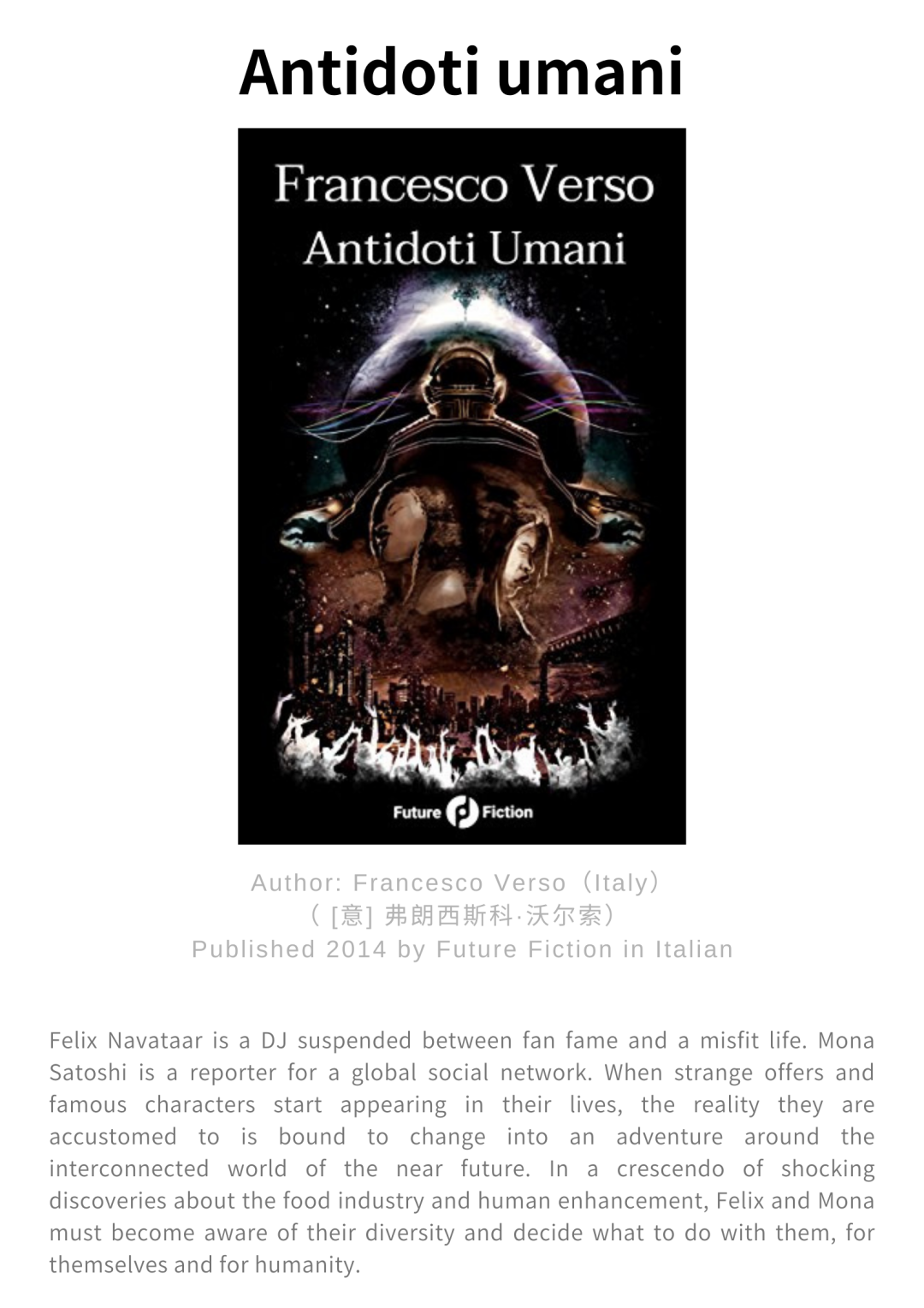 Verso is also editor and publisher of Future Fiction, a multicultural project dedicated to scouting and publishing the best World Science Fiction in translation from more than 35 countries and 13 languages with authors like Ian McDonald, Ken Liu, Liu Cixin, Vandana Singh, Chen Qiufan, and others. The project stemmed from Verso's own personal appetite for new and challenging narratives as he set about looking to encourage "literary biodiversity" and helping to play a role in "decolonising" the literary future.