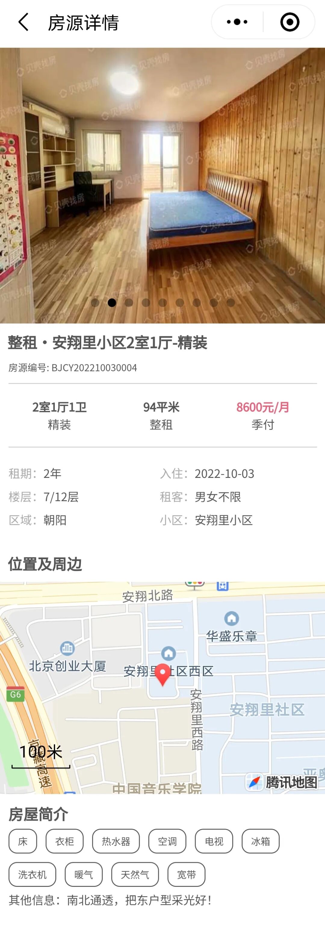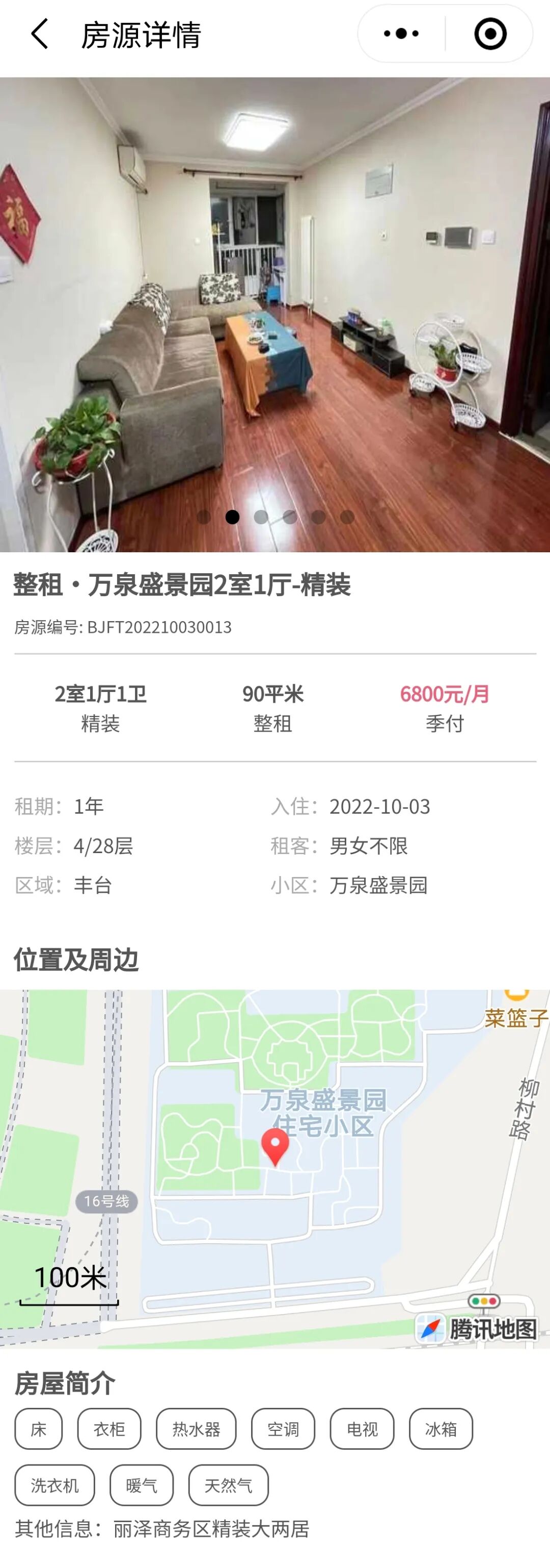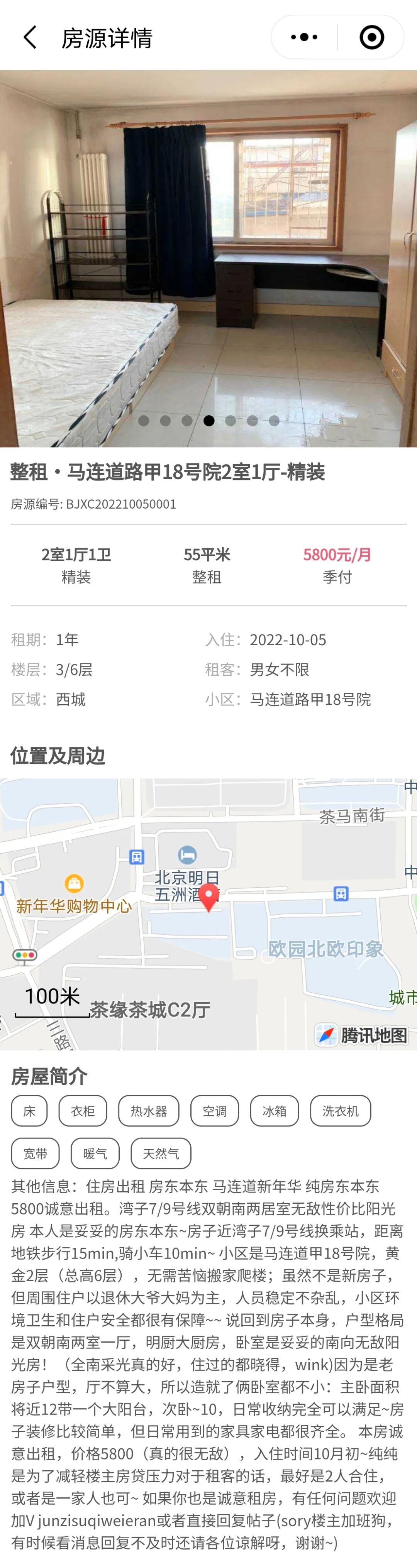 西二环外的马连道地区,周边有地铁湾子站,房屋双朝南两居,家具家电齐全。大中介APP上该小区同户型房源月租也是5800元。