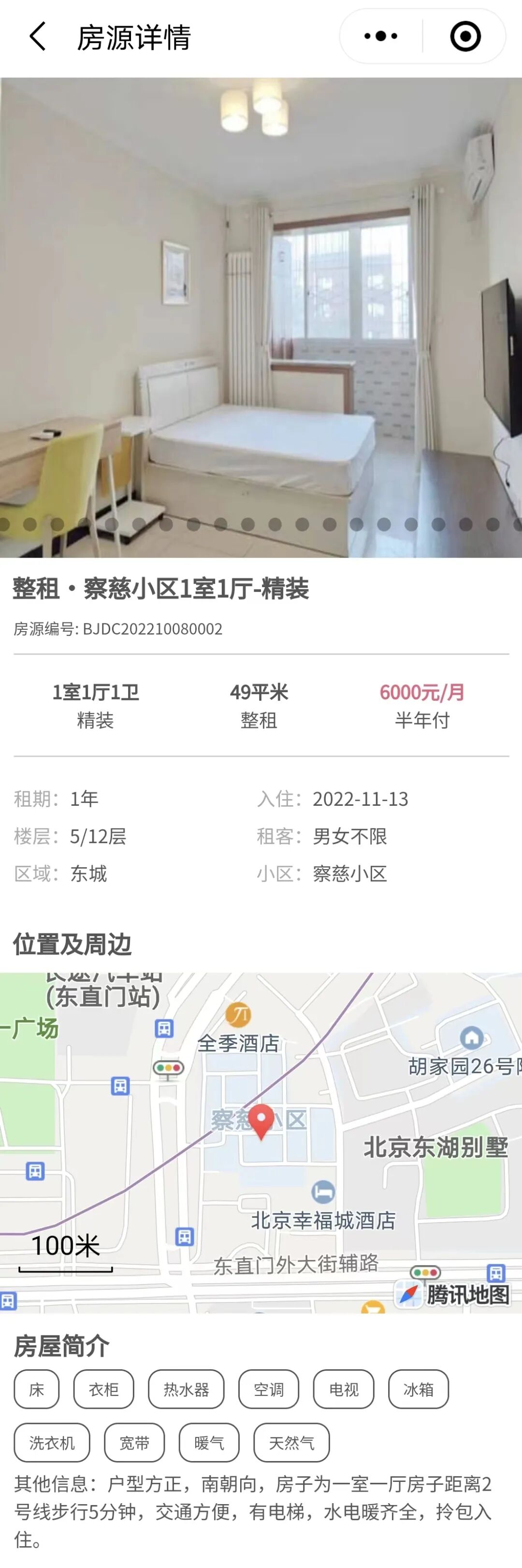 距离地铁东直门站步行5分钟,周边配齐全,户型方正,南朝向,有电梯,拎包入住。大中介APP上该小区同户型房源月租6800元。