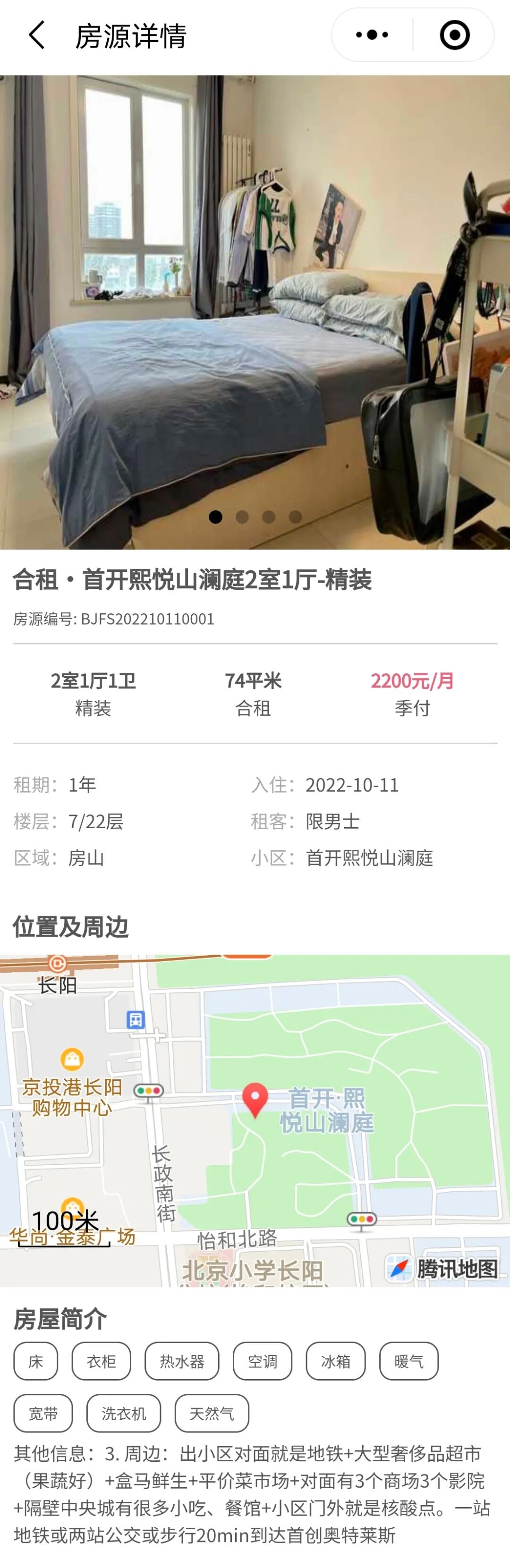 出小区对面就是地铁房山线长阳站,周边配套齐全。大中介APP上该小区16.4平米南卧月租2960元。