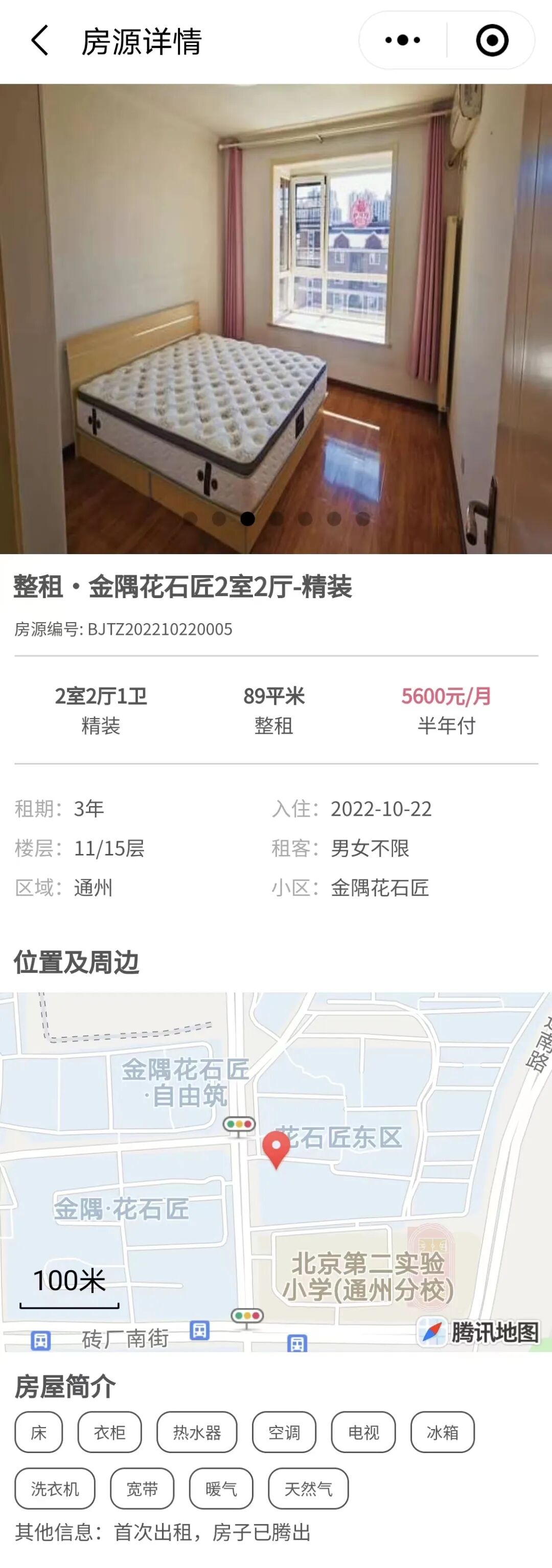 周边有地铁八通线土桥站,房屋首次出租。大中介APP上该小区同户型房源月租也是5600元。