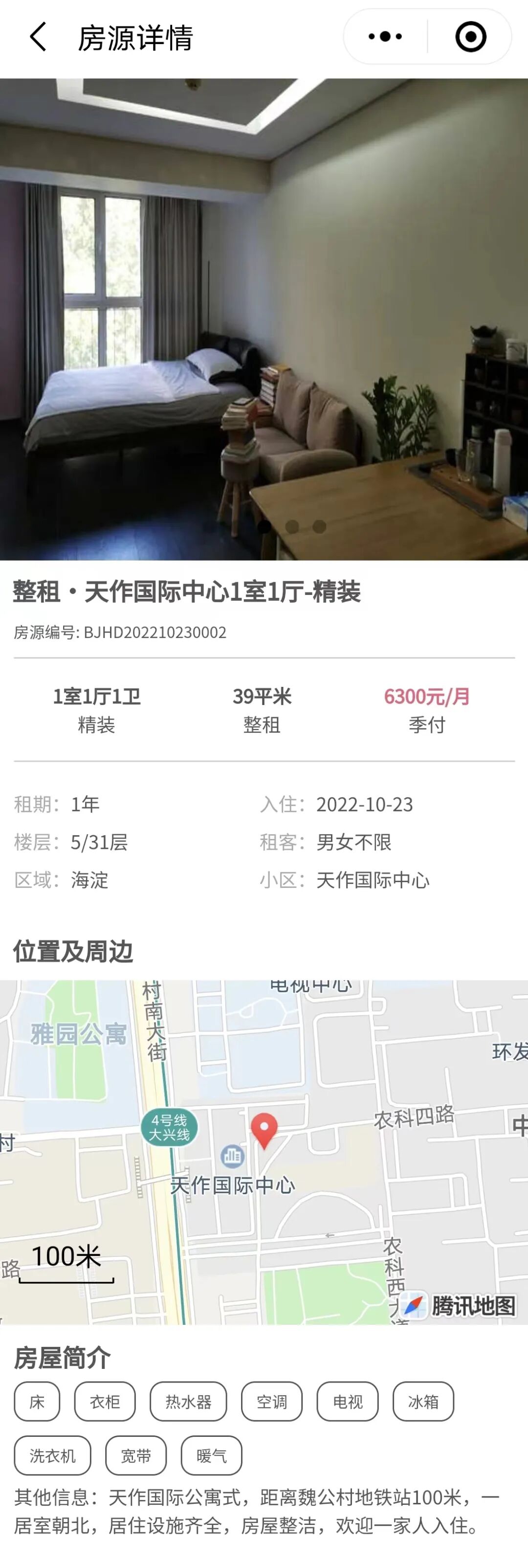 6、北理工对面一居室月租6300元