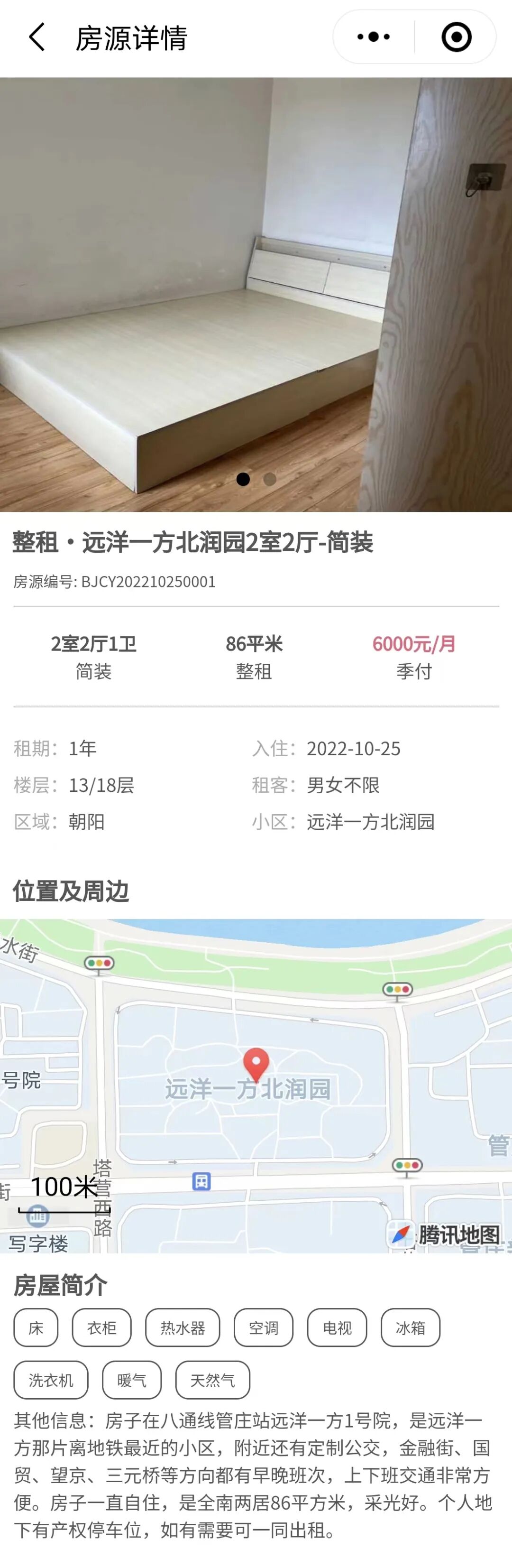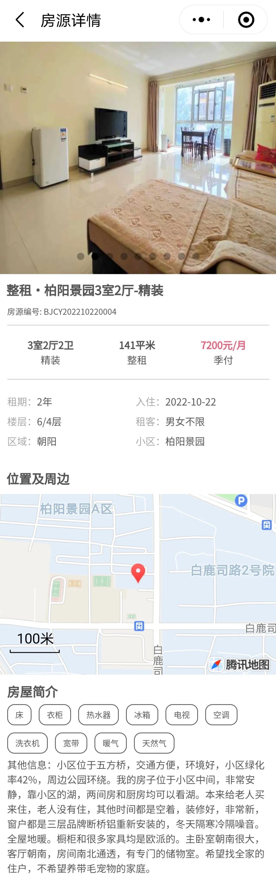 东五环五方桥附近,小区绿化率42%,房屋装修好,房间南北通透。大中介APP上该小区同户型房源月租7300元。
