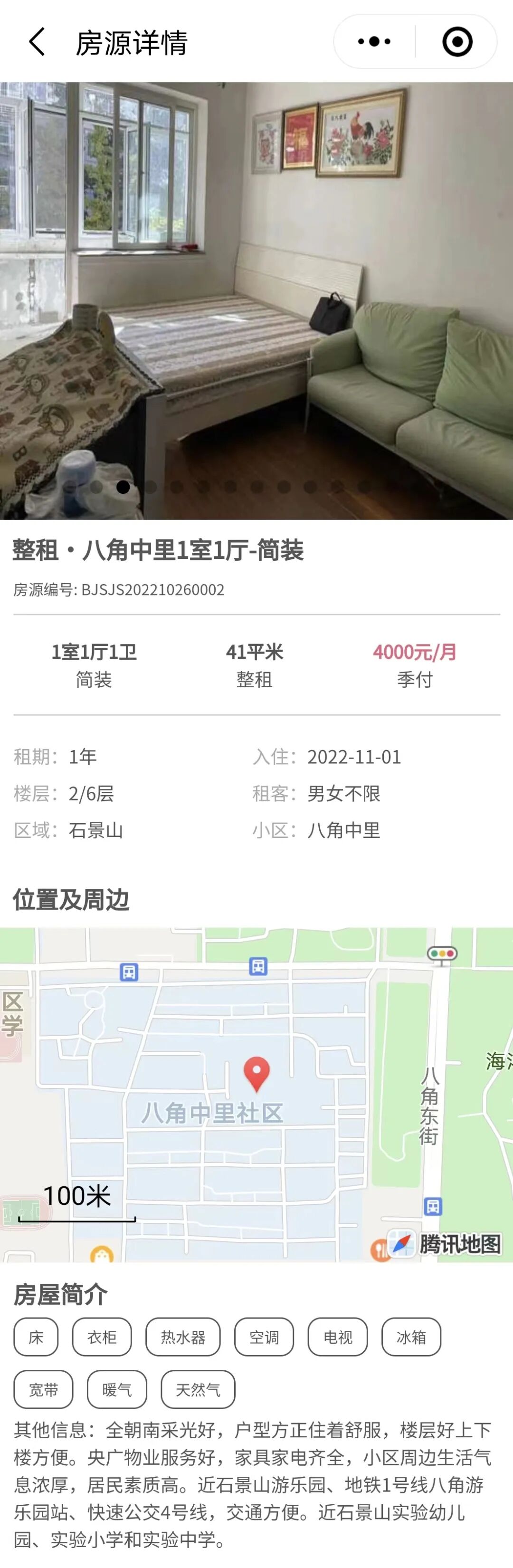 4、石景山八角一居室月租4000元