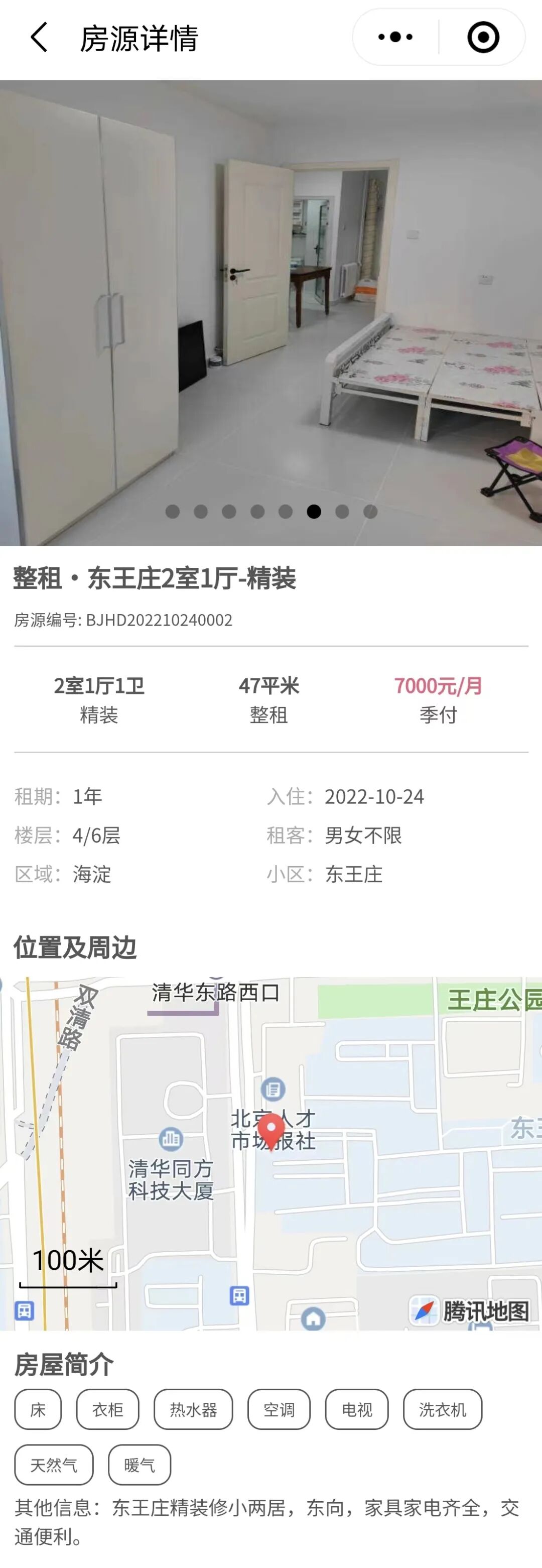 清华大学旁,紧挨清华东路西口站,精装修小两居,东向,家具家电齐全。大中介APP上该小区同户型房源月租6800元至7200元。