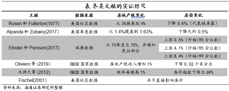 那么从海外的实证经验来看,实际情况更贴近哪种观点呢?由于影响房价的因素较多,而且房地产税影响房价的机制也较为复杂,简单地观察两者之间的数值相关性,一方面忽视了其它因素,如货币政策、信贷政策、居民收入等,对房价的影响;另一方面也不能准确地判断两者之间的因果关系。由此,我们通过梳理学术文献中的实证分析结果,来获得更精准的判断。